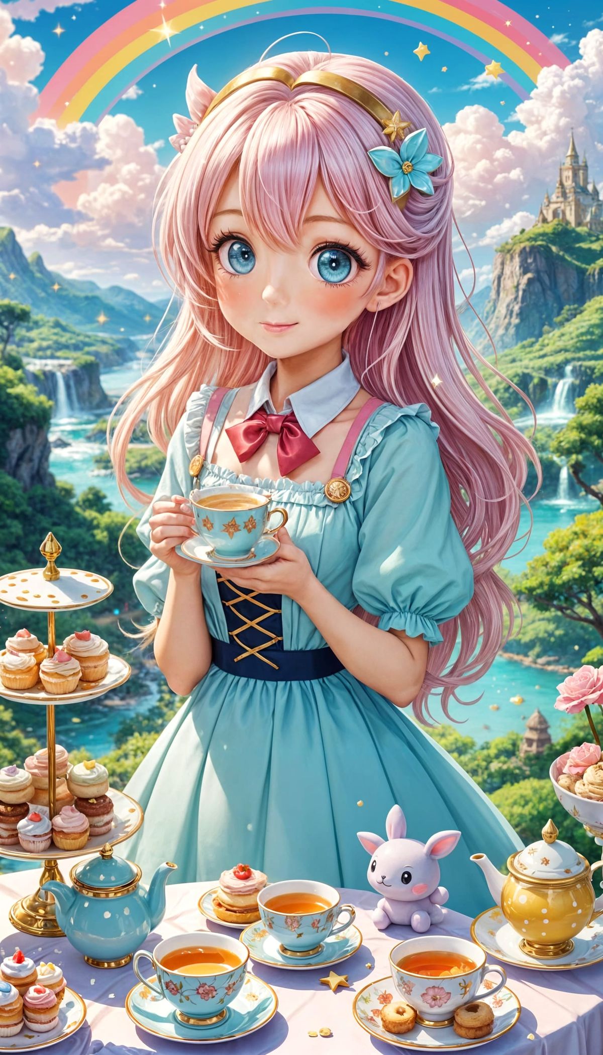 This image shows a magical girl hosting a tea party with animal friends. The scene features soft pastel colors, dreamy landscapes, and sparkling details reminiscent of classic anime and manga.