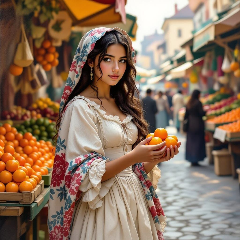 This image depicts a young Black woman in early Victorian attire purchasing oranges at a bustling 19th-century street market. Rendered in a romantic oil painting style, the scene is bathed in soft, natural light.