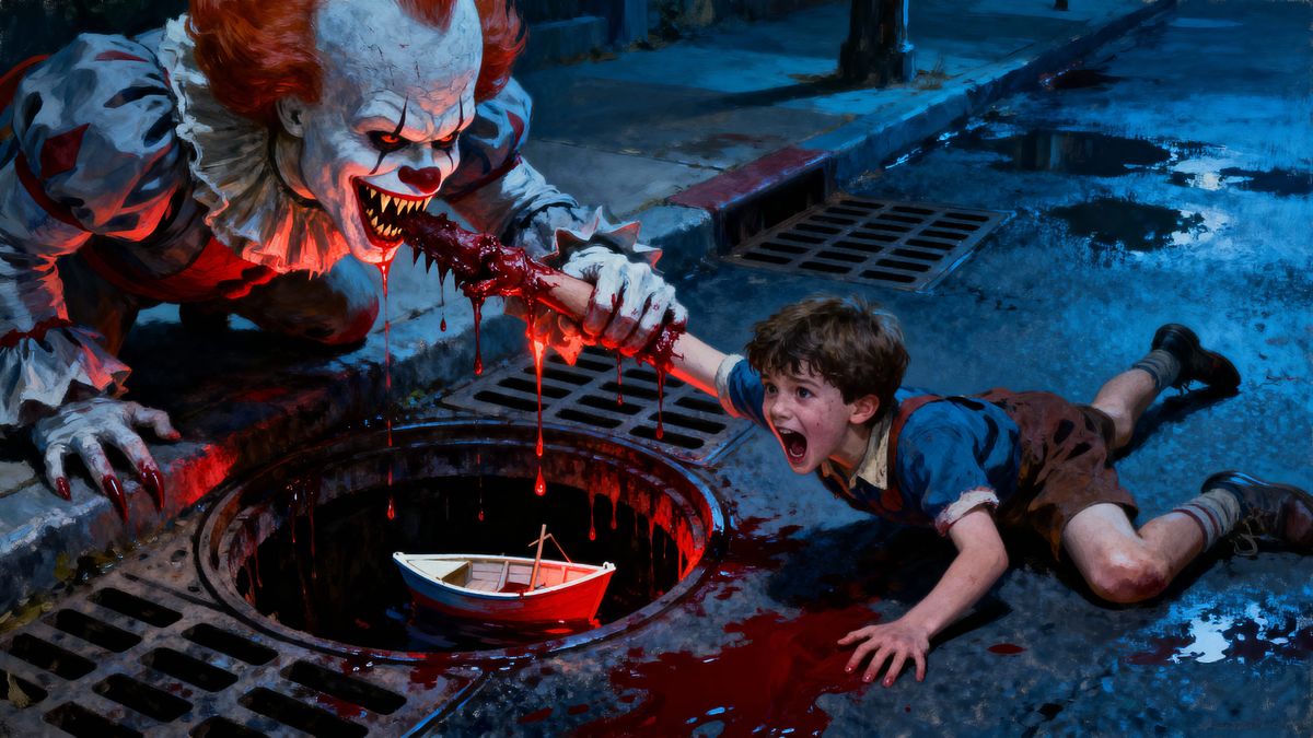 This dramatic oil painting depicts a terrifying scene where Pennywise the clown attacks a young boy named Georgie, biting his arm off in a sewer drain. Special effects enhance the horror.