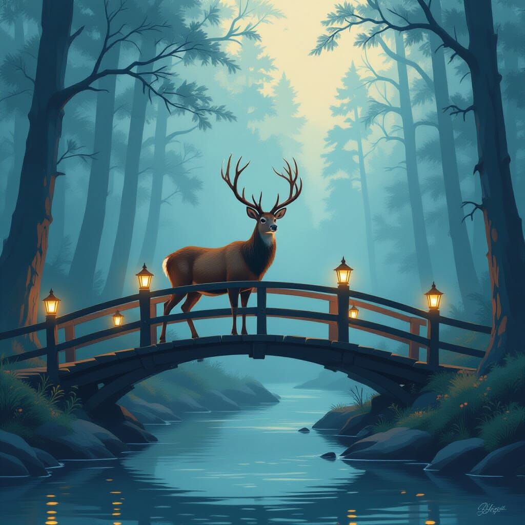 A misty forest scene featuring a deer on a lantern-lit bridge. The image evokes a warm, ethereal atmosphere, reminiscent of digital fantasy art.