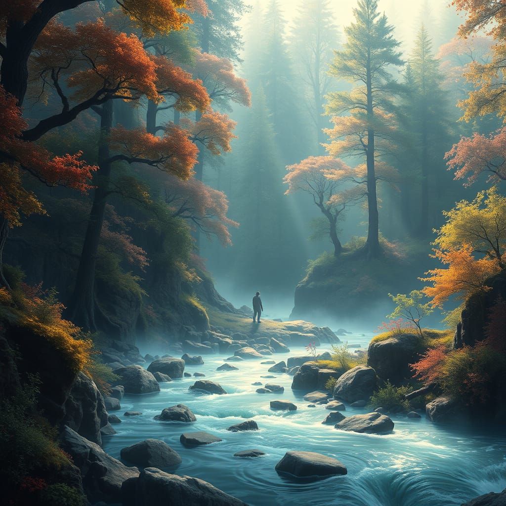 A vibrant abstract design depicting ocean current flows. The artwork features a large gnome within a hyperrealistic and magical forest landscape, all rendered with rich colors.