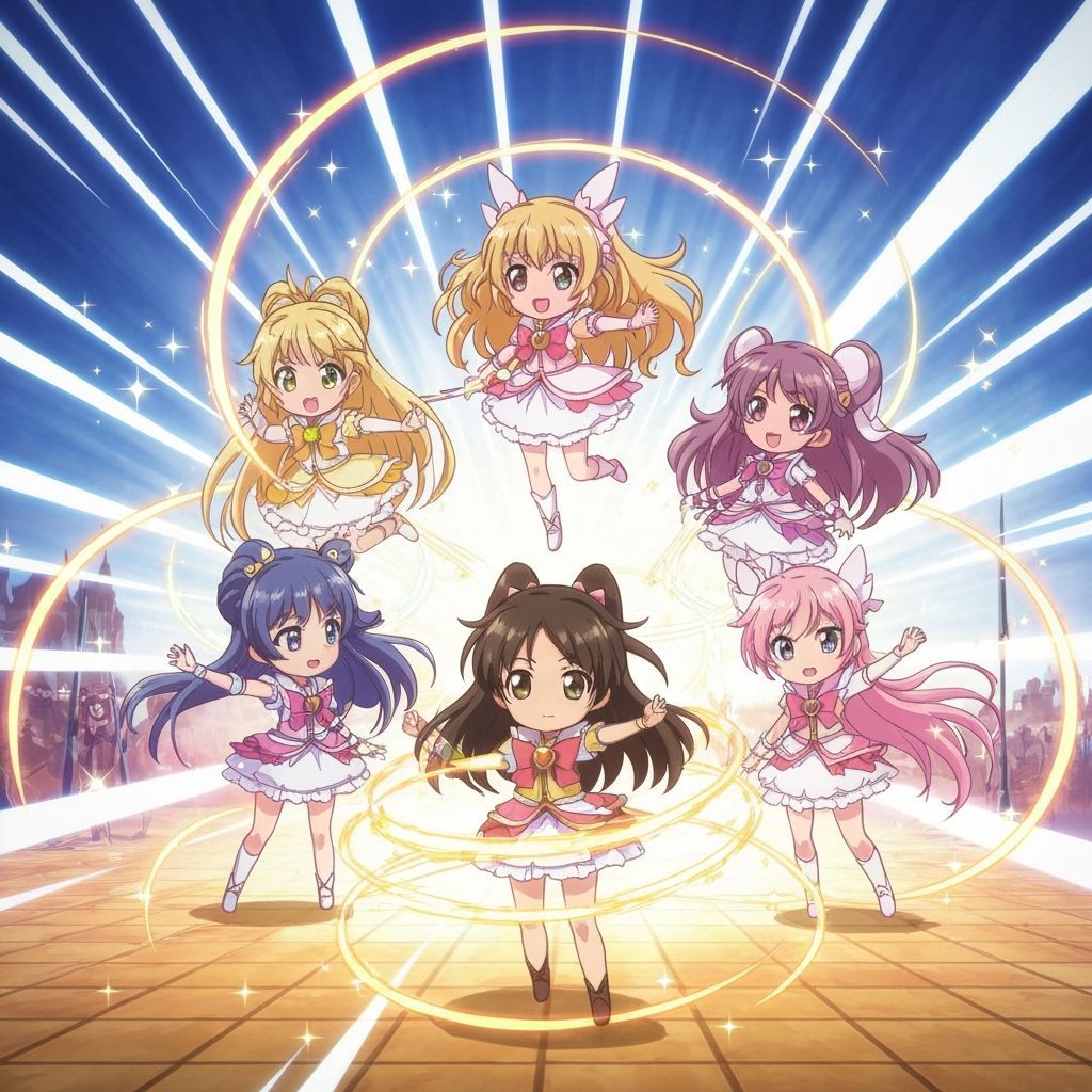 This image shows cute, chibi-style magical girls activating their powers with bright, sparkling energy and ribbons of light on an abstract battlefield, in a vibrant anime aesthetic.