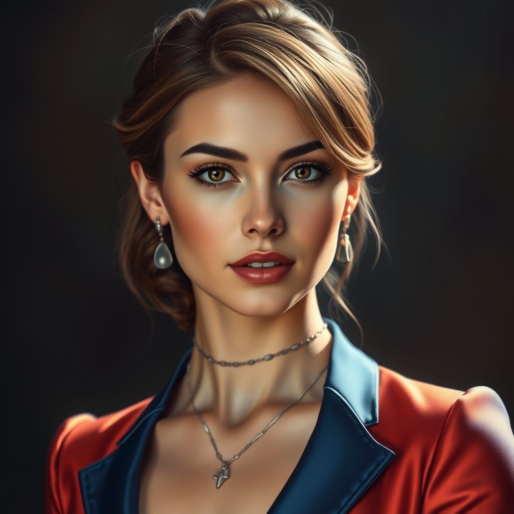 This image shows a stunning young woman exuding confidence and elegance, wearing a tailored, vibrant dress with intricate details and soft lighting, in a photorealistic style reminiscent of fine art.