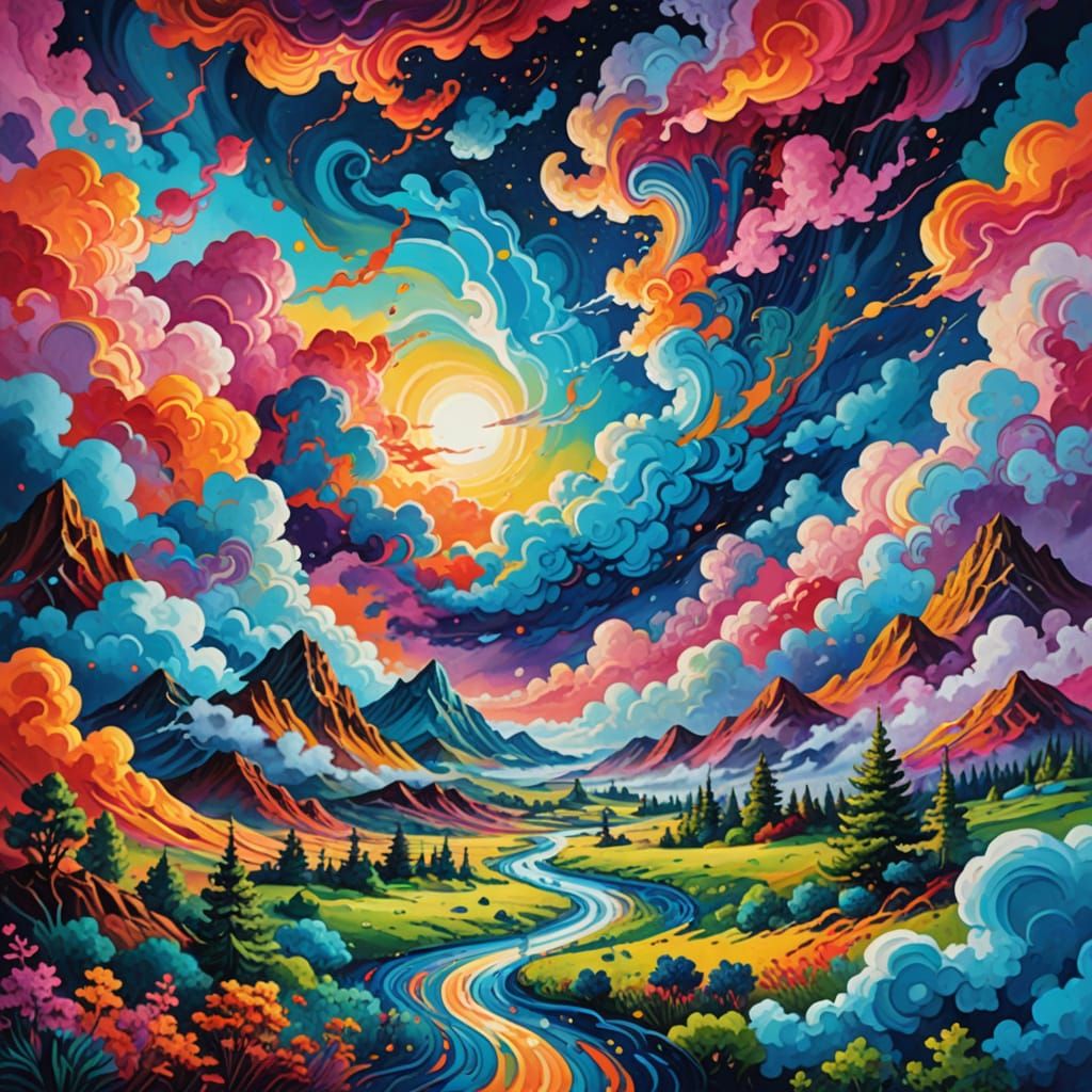 A vivid close-up of a person in a psychedelic fantasy world. The image features swirling clouds of color and detailed textures, rendered in a bright, complementary color palette as vibrant gouache painting.