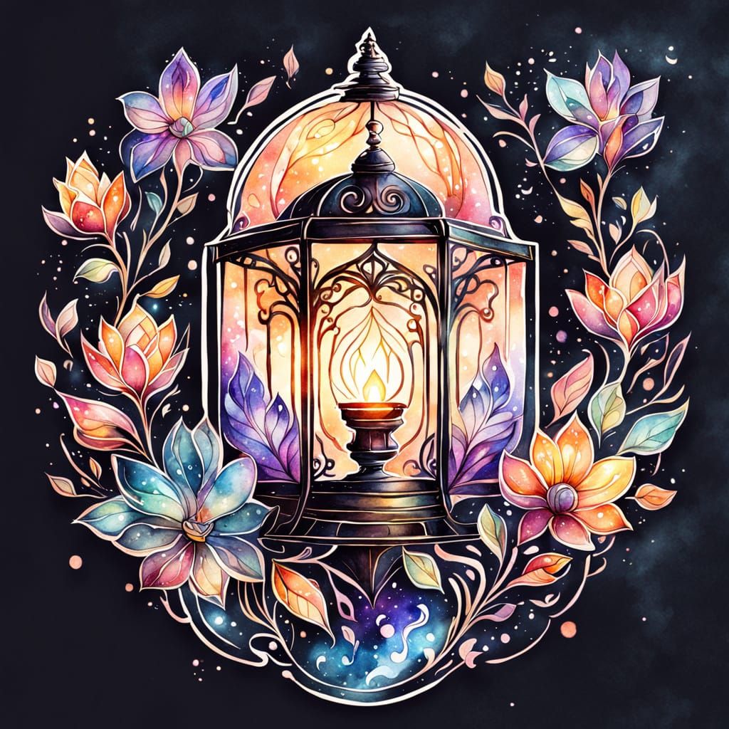 A travel lantern glows with a cosmic flower in a vibrant watercolor sketch style. Features art nouveau swirls and ethereal lighting, perfect for fantasy and travel art.