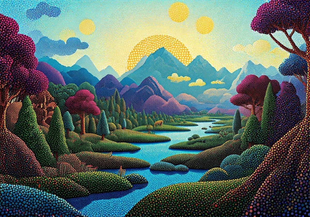 This image shows a surreal 2D world rendered entirely in polka dots. Mountains, trees, rivers, and skies are formed from vibrant dots in a pop-art style, creating a clean, high-contrast dreamscape.