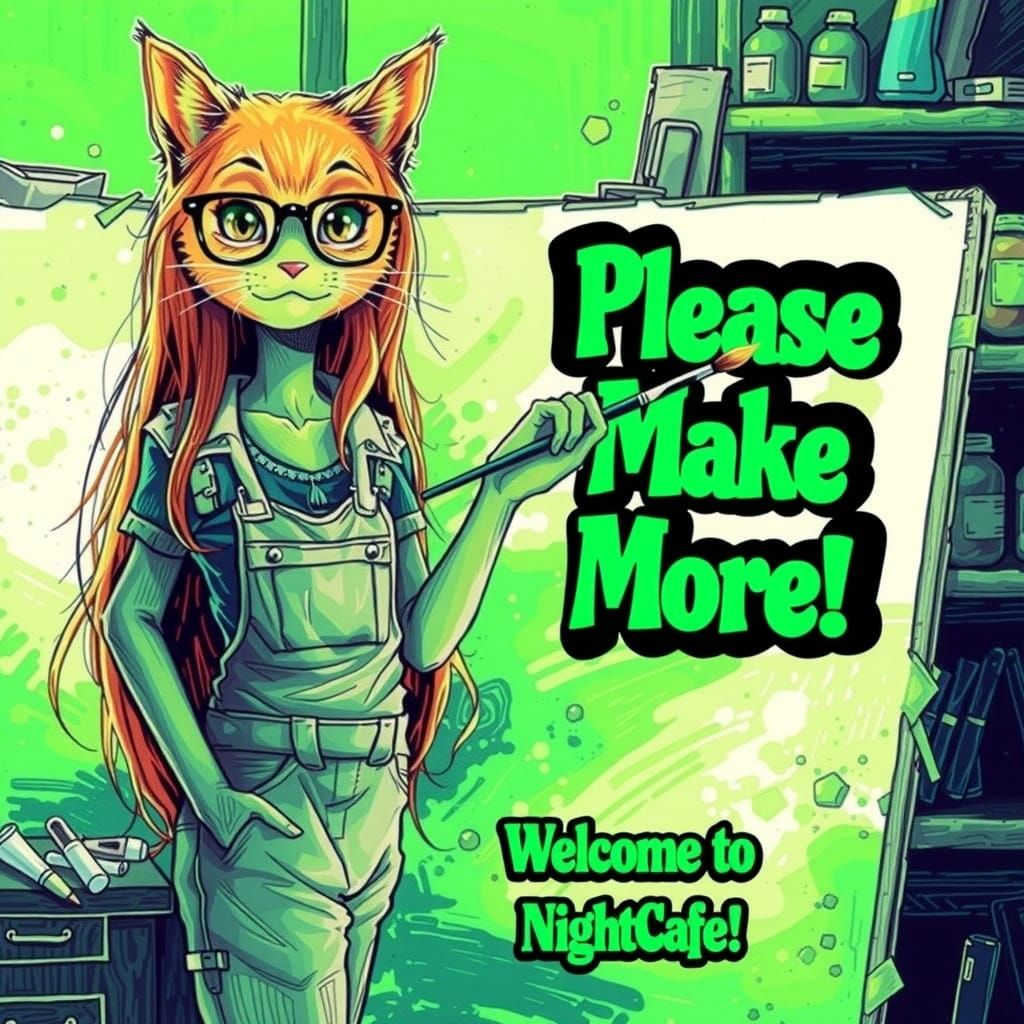 In a warmly lit art studio filled with scattered paint supplies and shelves brimming with art materials, a charming anthropomorphic female BLACK cat with long BLACK hair, Amber eyes, wearing glasses, stands gracefully in front of an easel. She holds a paintbrush delicately in her paw, her expression ...