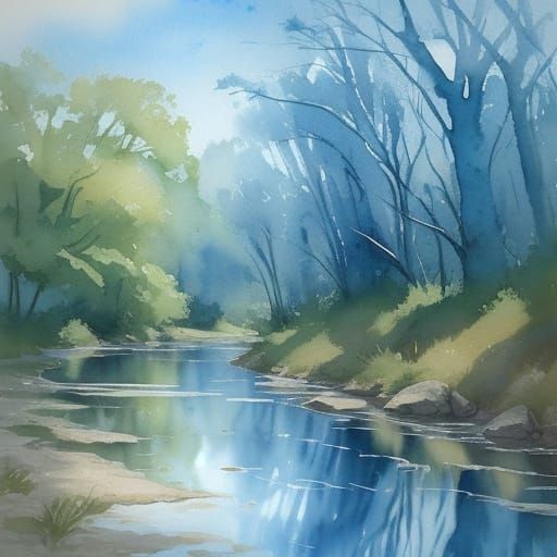 This illustrative image features a cat beside a river, rendered with expressive brushstrokes and a loose watercolor texture. Vibrant blue reflections and soft light create a dreamy, fantastical scene.