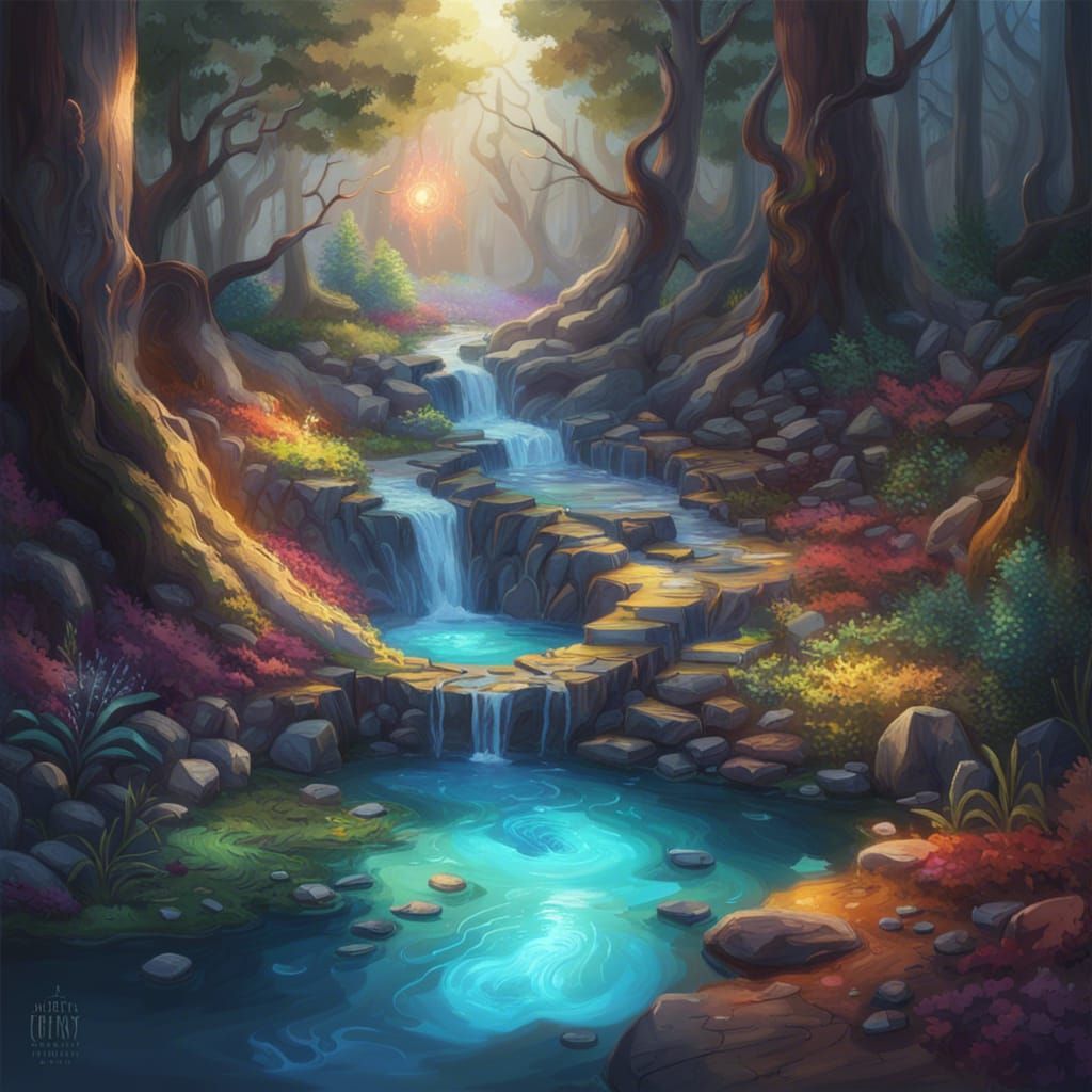 This image shows a hyperrealistic and intricately detailed pool of water in a forest grove. The vibrant splash art features a colorful background illuminated by dramatic side lighting.