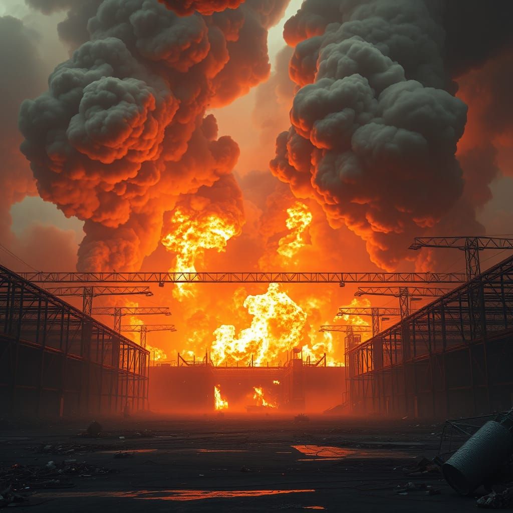 A dramatic image of a warehouse fire viewed from a distance. Billowing smoke and intense flames rise from the destroyed structure, in a dystopian, catastrophic style.