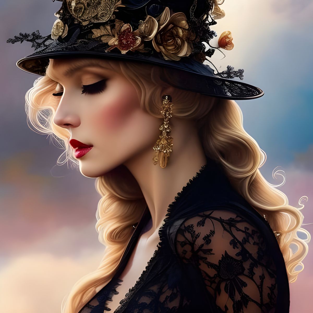 A hyperdetailed close-up of a beautiful blonde woman wearing a lacy black dress, set against a sunny sky. The image is reminiscent of Rococo art, with delicate and cinematic qualities.