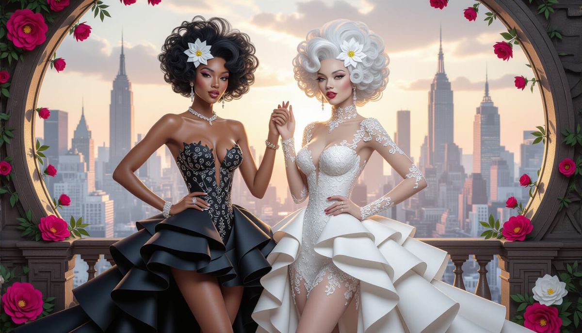 This image shows two glamorous women in a dark fantasy cityscape. The image features hyperdetailed elements, short skirts, and elaborate gowns, with Escher-esque architecture and origami paper folds.