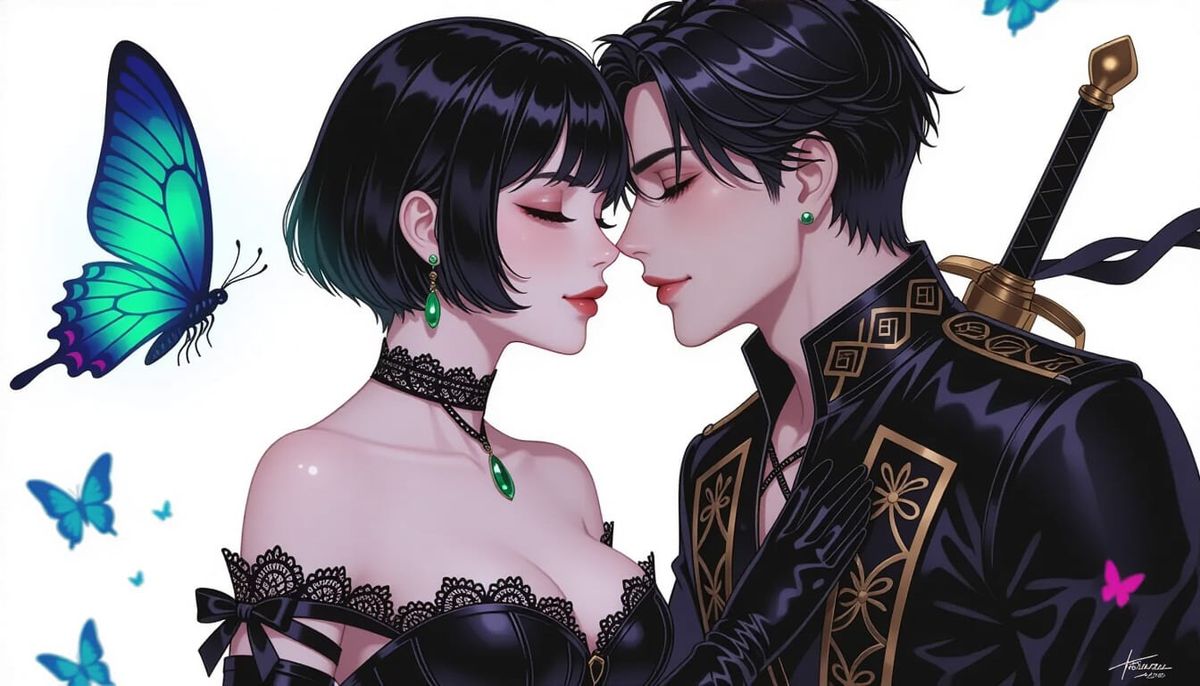 This image shows a cinematic anime-style illustration of Katerina Heiss, an adult woman with striking features, sharing a tender kiss. Soft lighting and drifting rose petals enhance the intimate mood in this gothic scene.