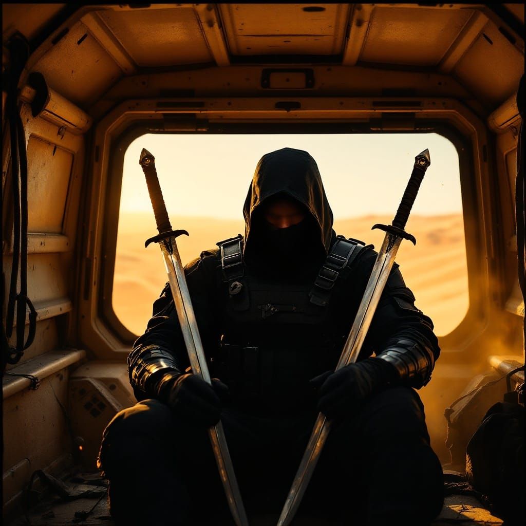 A lone warrior sits in the back of a military truck, driving through a vast desert landscape. Clad in tactical gear, he holds polished katana swords, surrounded by worn, dusty interior and endless dunes stretching to the horizon.