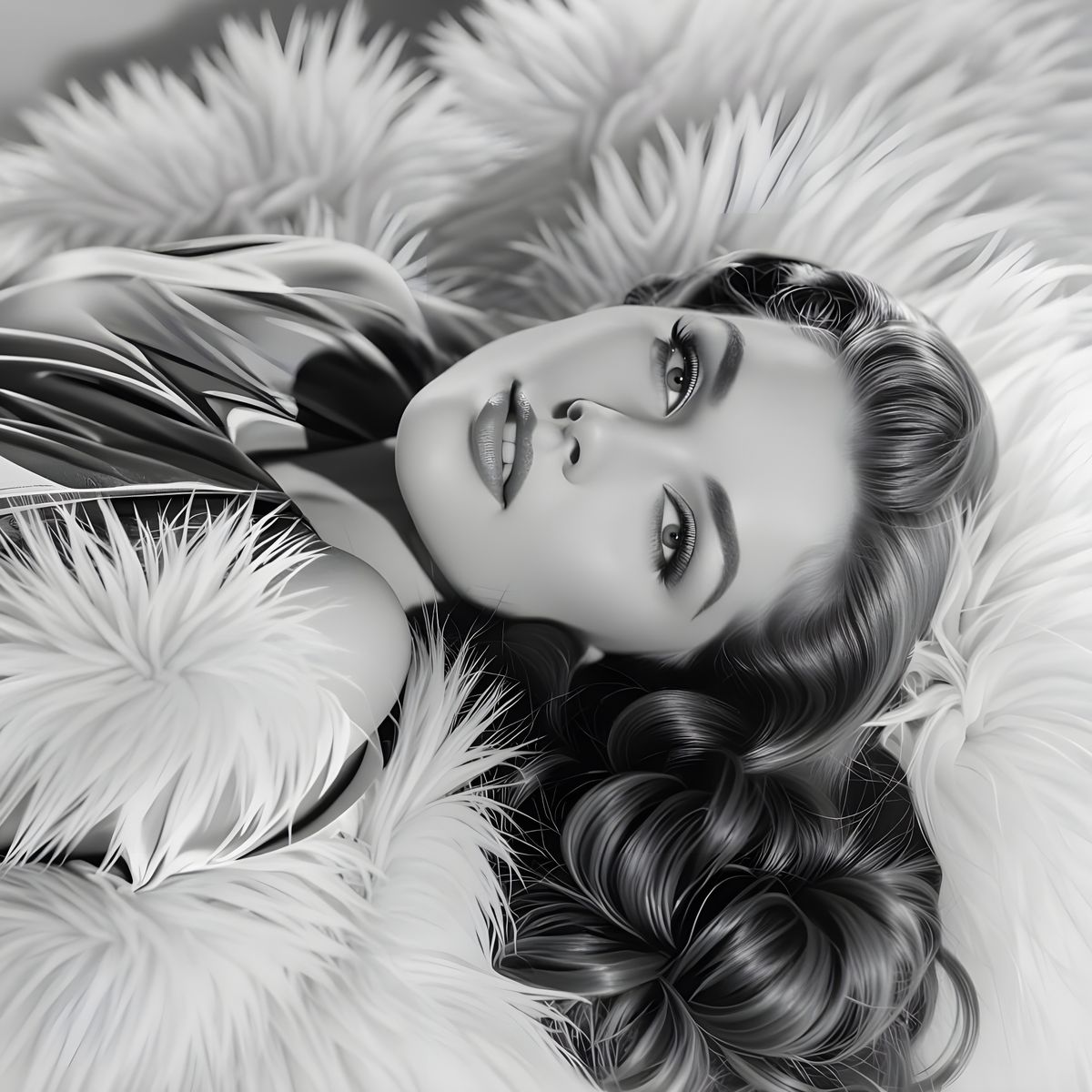 This image shows a glamorous woman reclining on fur. The monochrome portrait features soft lighting, wavy hair, and satin textures to create a serene and intimate mood.