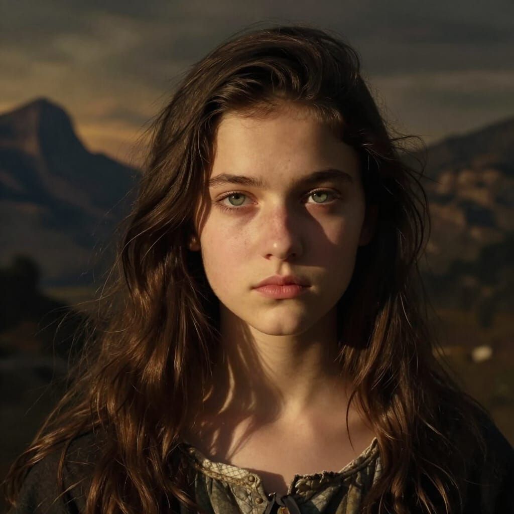 This image shows a 16-year-old girl with striking green eyes and dark hair, illuminated by dramatic late afternoon light. Painted in a Romanticism style, it features atmospheric depth and rich, earthy tones.
