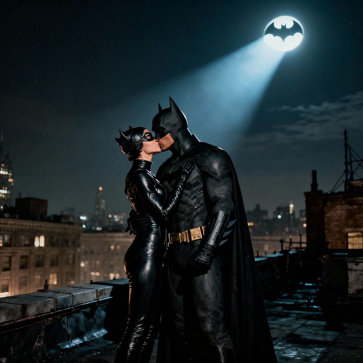 A cinematic image capturing Batman and Catwoman kissing on a building at night, illuminated by the Bat-Signal. Shot with dramatic lighting and film grain.