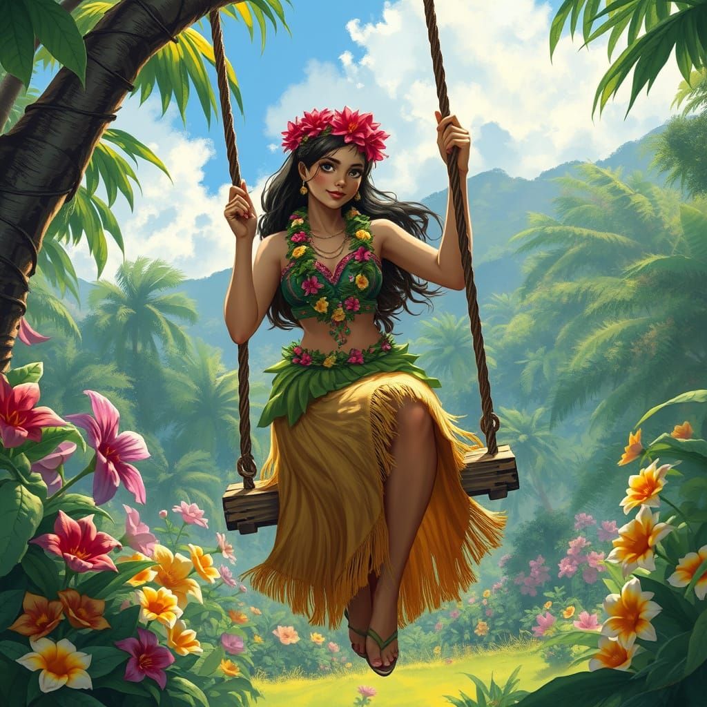 A Hawaiian hula dancer on a wooden swing in a vibrant garden. This image blends dark fantasy, impressionism, anime, and comic book aesthetics to create a unique scene.