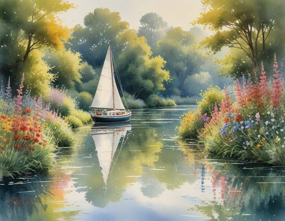 A watercolour painting of a sailboat mirrored in a sun-drenched river garden. Floral clusters and wildflowers create a vibrant scene with stylized, fine art rendering and splashy white space.
