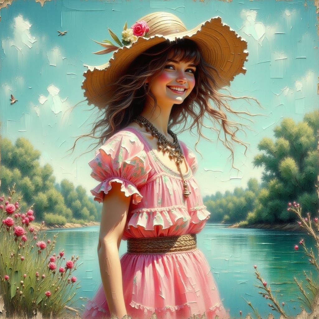 little joyful girl laughing, floppy hat, floral dress standing at the edge of the lake Vintage art, pink and sea green hues, sunny day, splash art, in style of Dante Gabriel Rossetti, Yossi Kotler, Camilla D'Errico, masterpiece, fine art in style of Carne Griffiths, Paula Hoppe <lora:TexturizedV2:1.0> ...