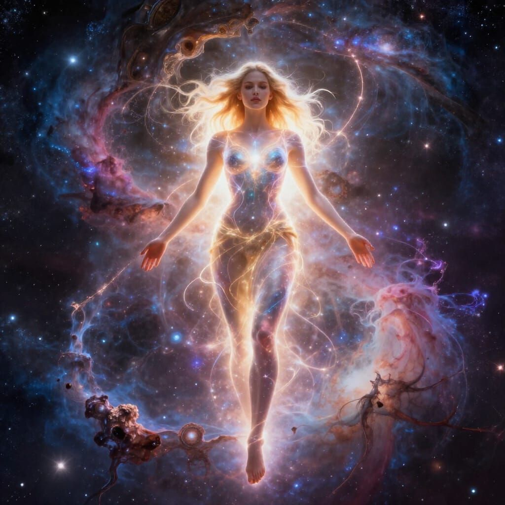 This image shows a woman at her peak potential within the universe, rendered in a dramatic, atmospheric, and highly detailed digital matte painting style.