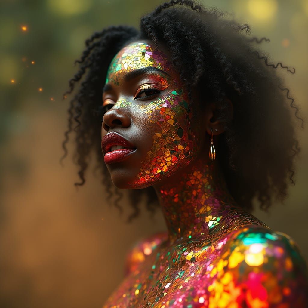 This image depicts a mesmerizing, curvy African American woman with a body and face crafted from intricately shattered mirror glass, surrounded by a warm, golden misty fog and vibrant tie-dye paint. Her eyes burn with an intense, fiery green hue, while her lips seem to glow with an inner light.