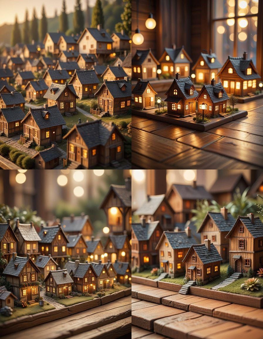 A charming picture of a miniature wooden village with stylized houses. The scene features textured roofs, warm earthy tones, and a handcrafted aesthetic under soft, ambient lighting. As professional photography.