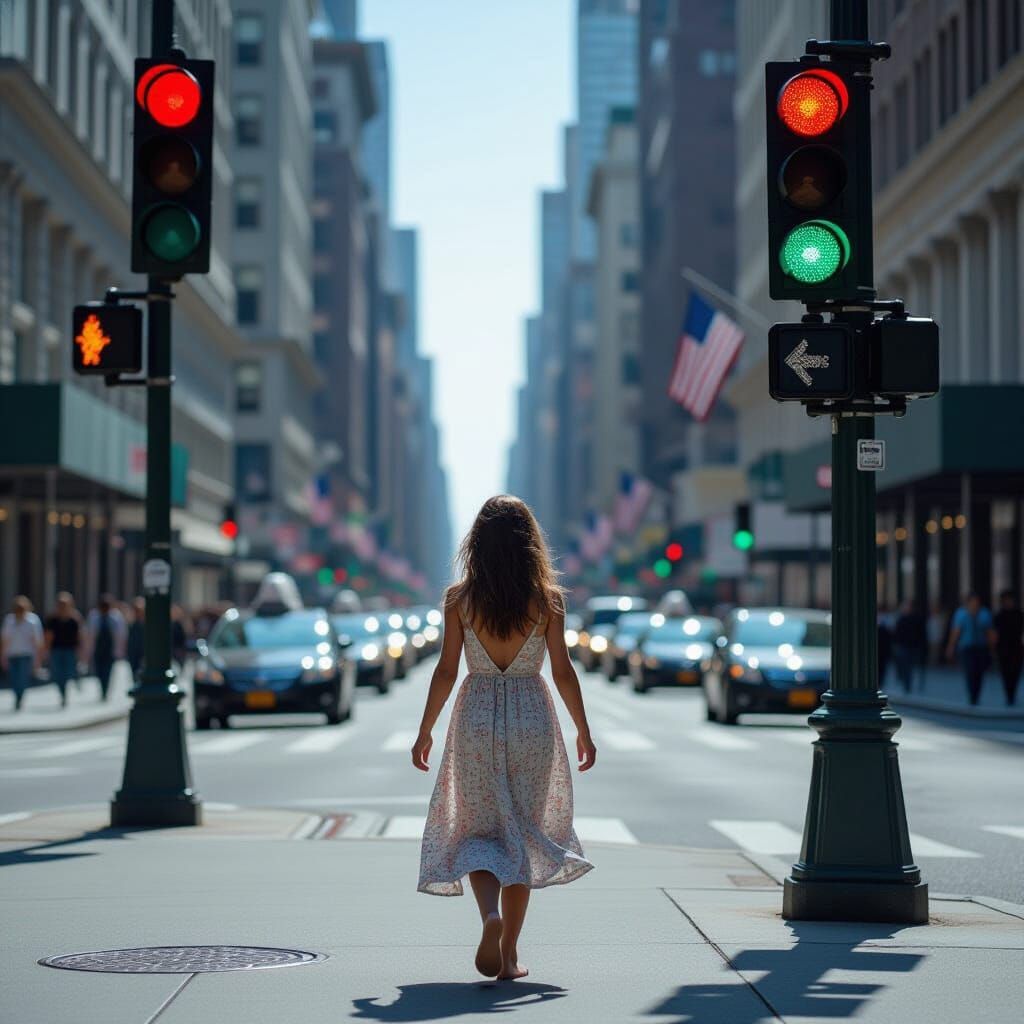 This image shows a barefoot girl in a sundress walking through a city as a traffic light yields to her. An aerial traffic cop smiles as she nods, all captured with cinematic lighting and a film aesthetic.