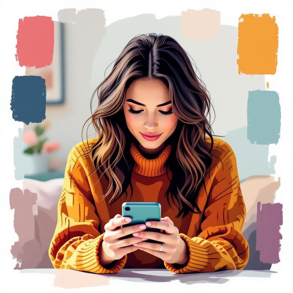 This image shows a young woman lost in thought, gazing at her phone amidst a kaleidoscope of colors and shapes, evoking a sense of longing and introspection.