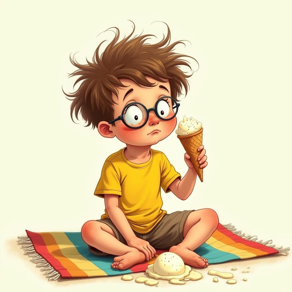 A young boy's sweet treat turns into a messy puddle on a colorful beach towel, as he looks on in dismay, in a style reminiscent of classic illustrations and cartoons.