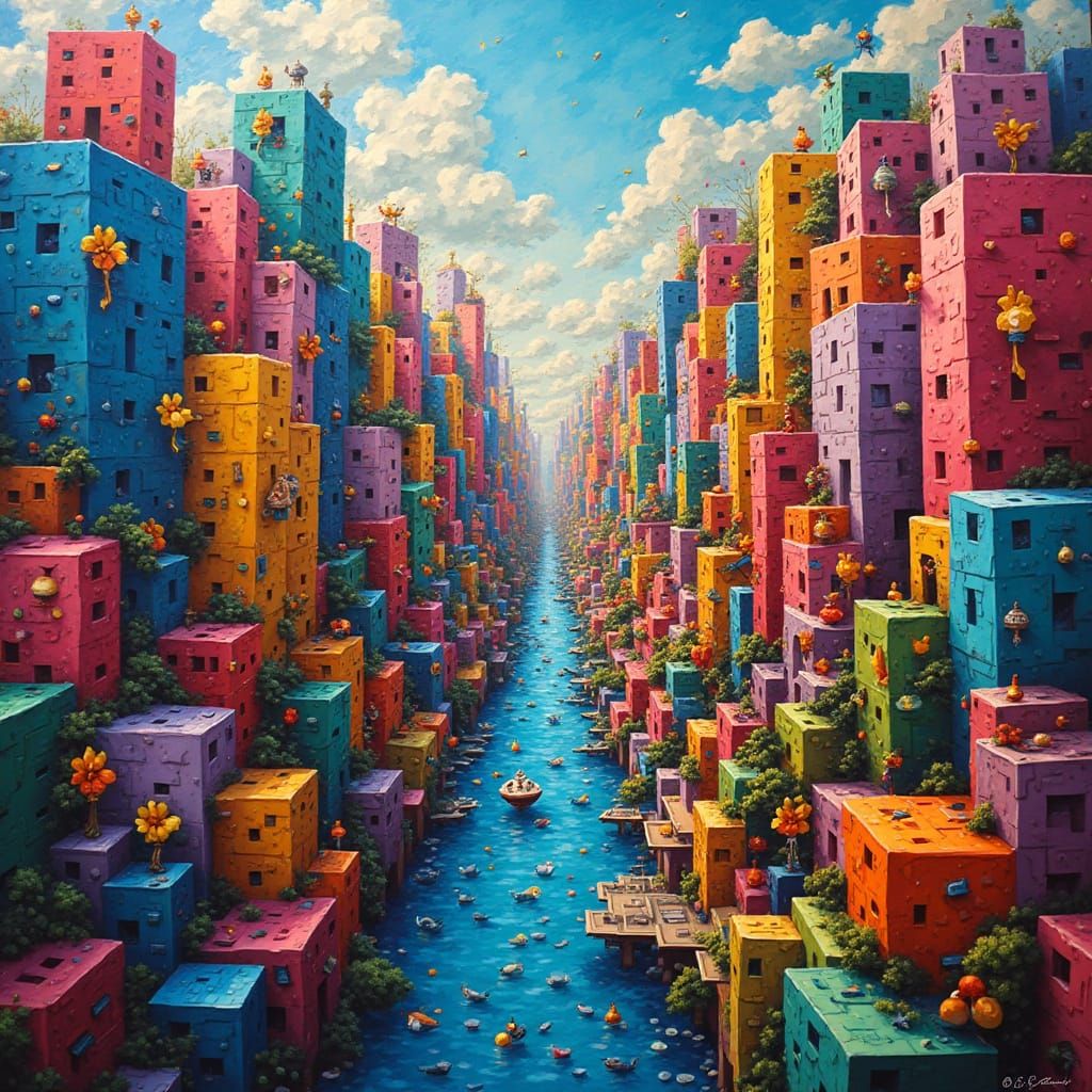 This image depicts a futuristic city made entirely of colorful Rubix cube blocks, blending cubist and Minecraft-inspired aesthetics with a vibrant splash of deep, rich colors.