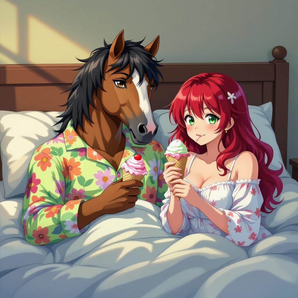 This image shows a centaur-like man in pajamas sharing ice cream in bed with a woman. The artwork features bold colors and cinematic lighting in a cel-shaded anime style.