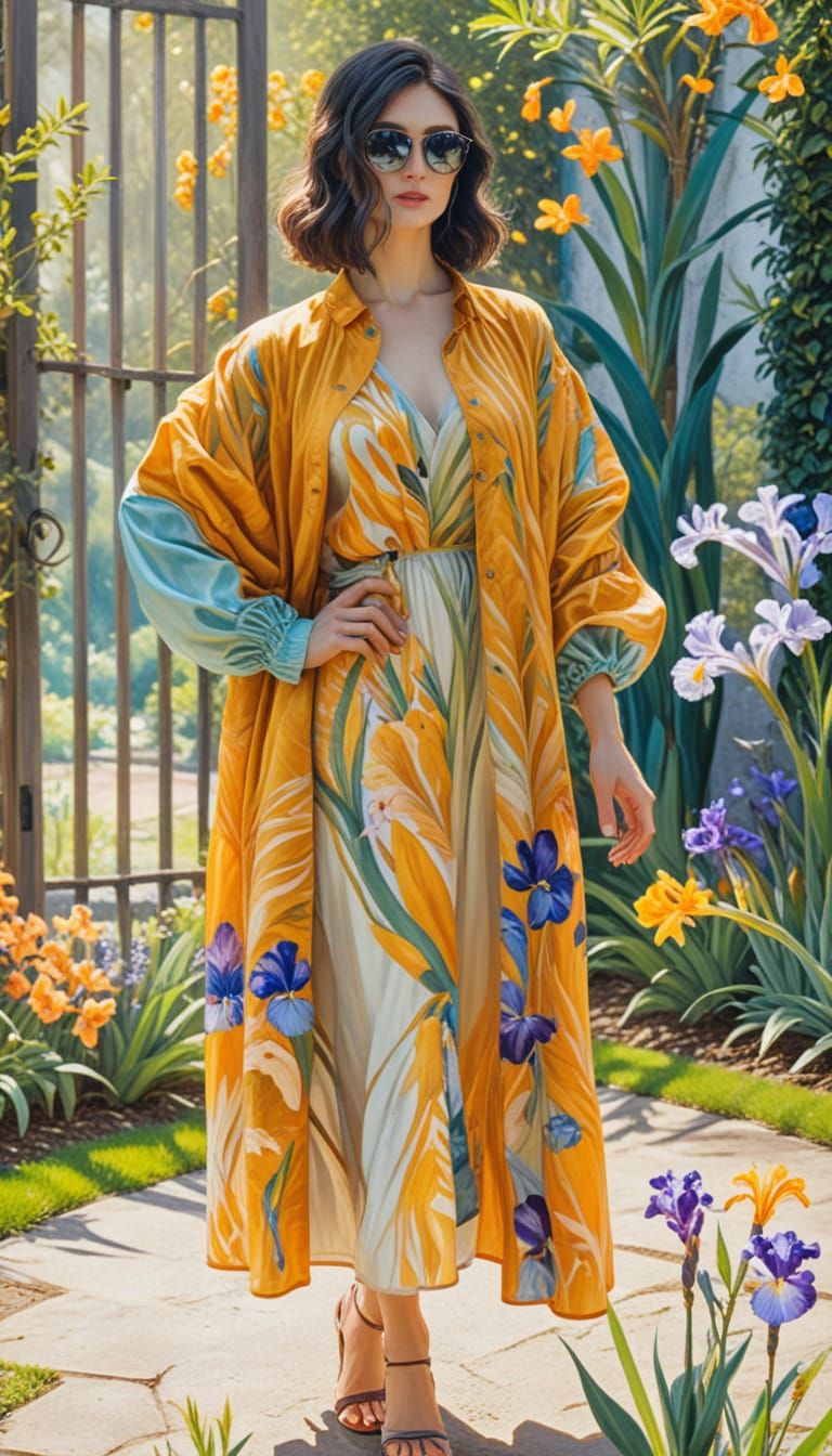 This is summer made silk. A garden that walks. The vibrant gold of the outer coat doesn’t just shine—it sings. The oversized shape flows like a breeze across her figure, a caress more than a garment. The floral motifs—irises, lilies, petals of bold violet and tender ivory—don’t decorate, they breathe. There’s something cinematic in her stance, yet intimate in her elegance. Sunglasses as armor, sandals as whispers. This is not fashion for display—it’s fashion as poetry. She doesn’t enter the scene. She becomes it. And the world around her blooms in grateful response.