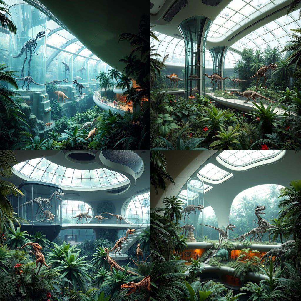 This image shows a futuristic paleontology museum nestled within a vibrant rainforest. Towering glass enclosures display dinosaur skeletons amidst lush vegetation, in a modern architectural style.
