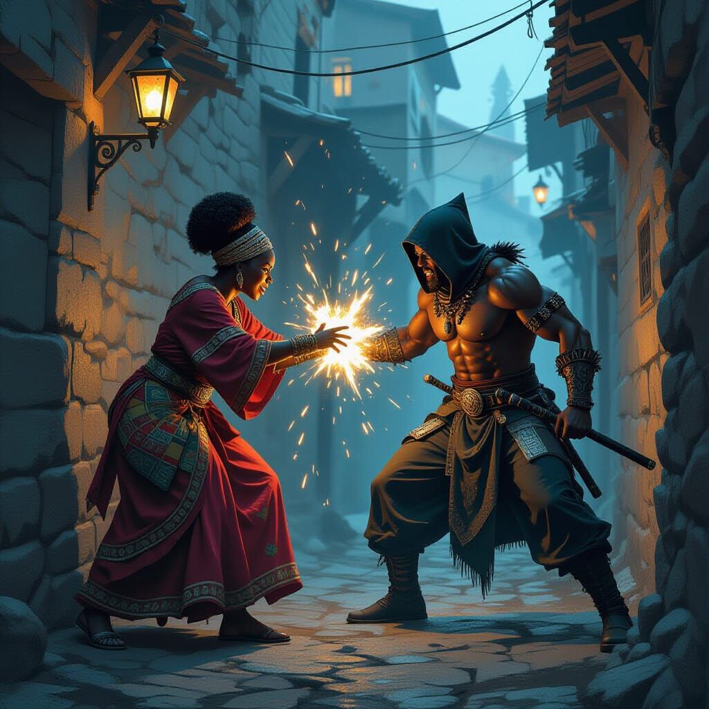 This image shows a dramatic battle in a dark alley between Mama Jinja, an African woman, and Olum, an assassin. The scene features dramatic lighting and intense action in a comic book style.