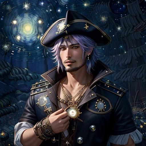 A steampunk-styled fantasy image of a male pirate wearing a heart bracelet, set against a backdrop of a starry night sky with a full moon, rendered with a cinematic golden ratio.