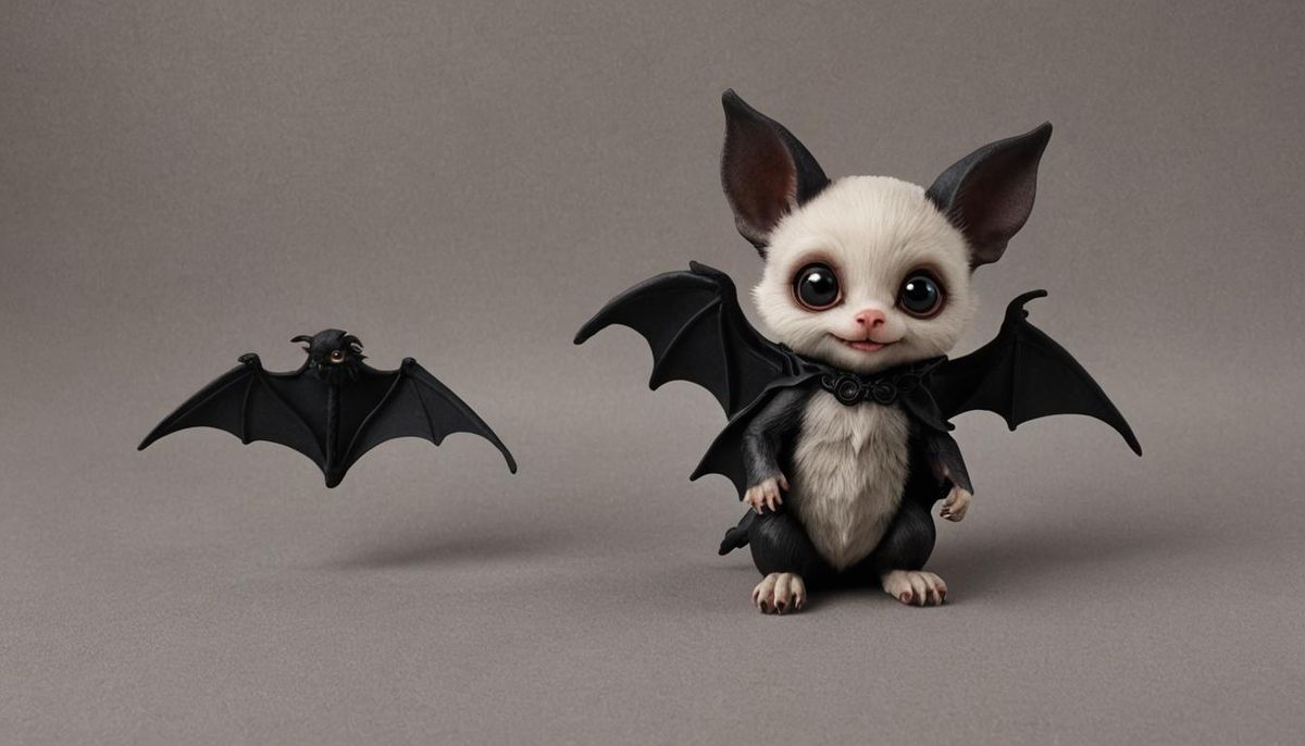 This image shows a cute vampire bat designed for maximum cuteness. The artwork blends eerie and adorable elements, featuring big, round eyes and a sweet, playful smile in a hyperrealistic style.