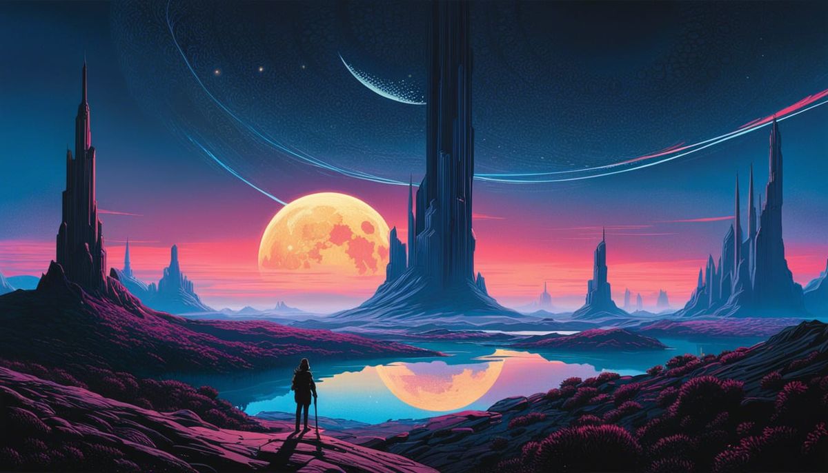 A surreal fantasy landscape featuring a giant moon under a detailed starry sky. The image evokes a matte painting with intricate details and a golden ratio composition, reminiscent of underground comix art.
