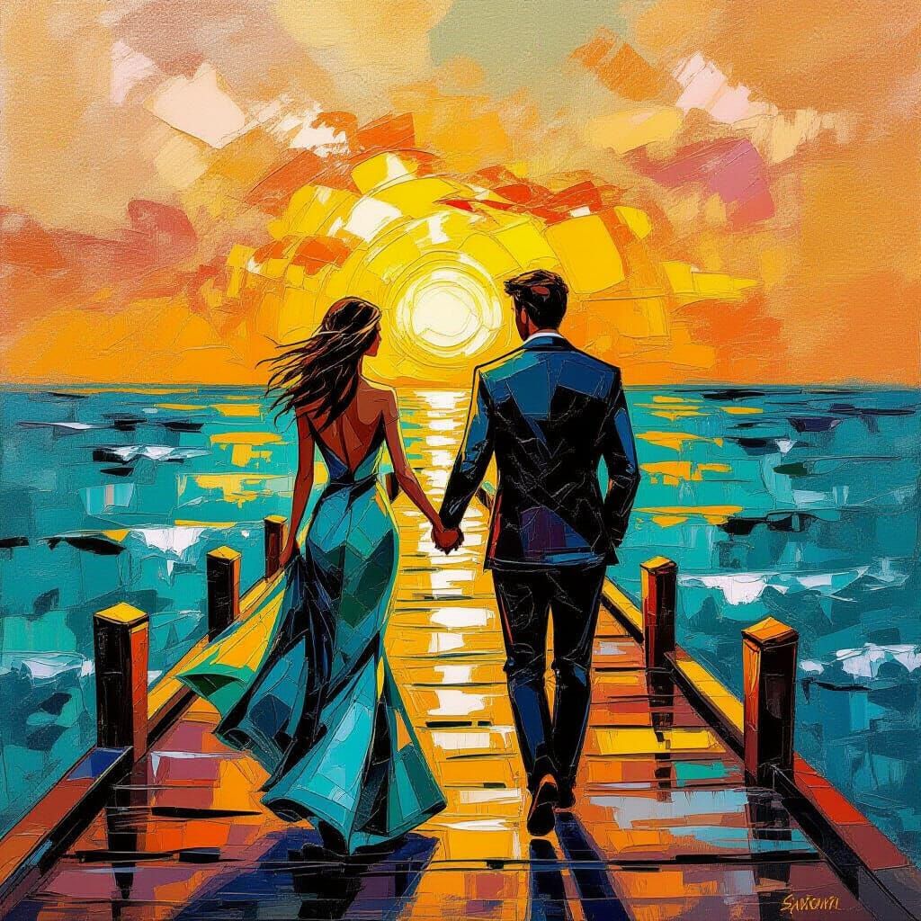 A vibrant painting of a woman and man walking on a pier at sunset. The artwork features golden lines and a colorful texture with tones of gold, green, and turquoise in mixed media.