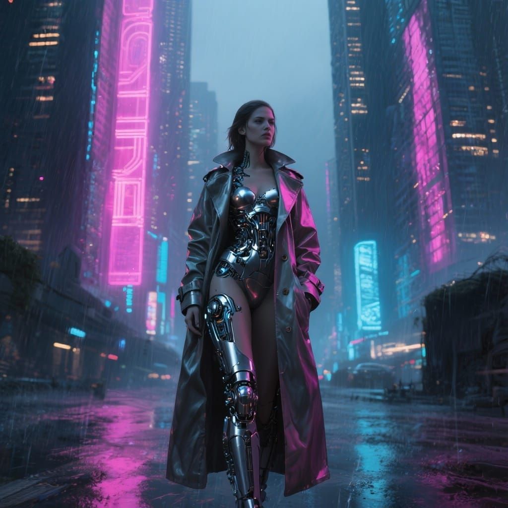 A solitary cybernetic woman in a trench coat stands on a rain-slicked, neon-drenched cityscape at dusk. Monolithic skyscrapers reflect pulsating lights. Rendered with dramatic lighting and painterly texture, featuring vibrant pinks and blues.