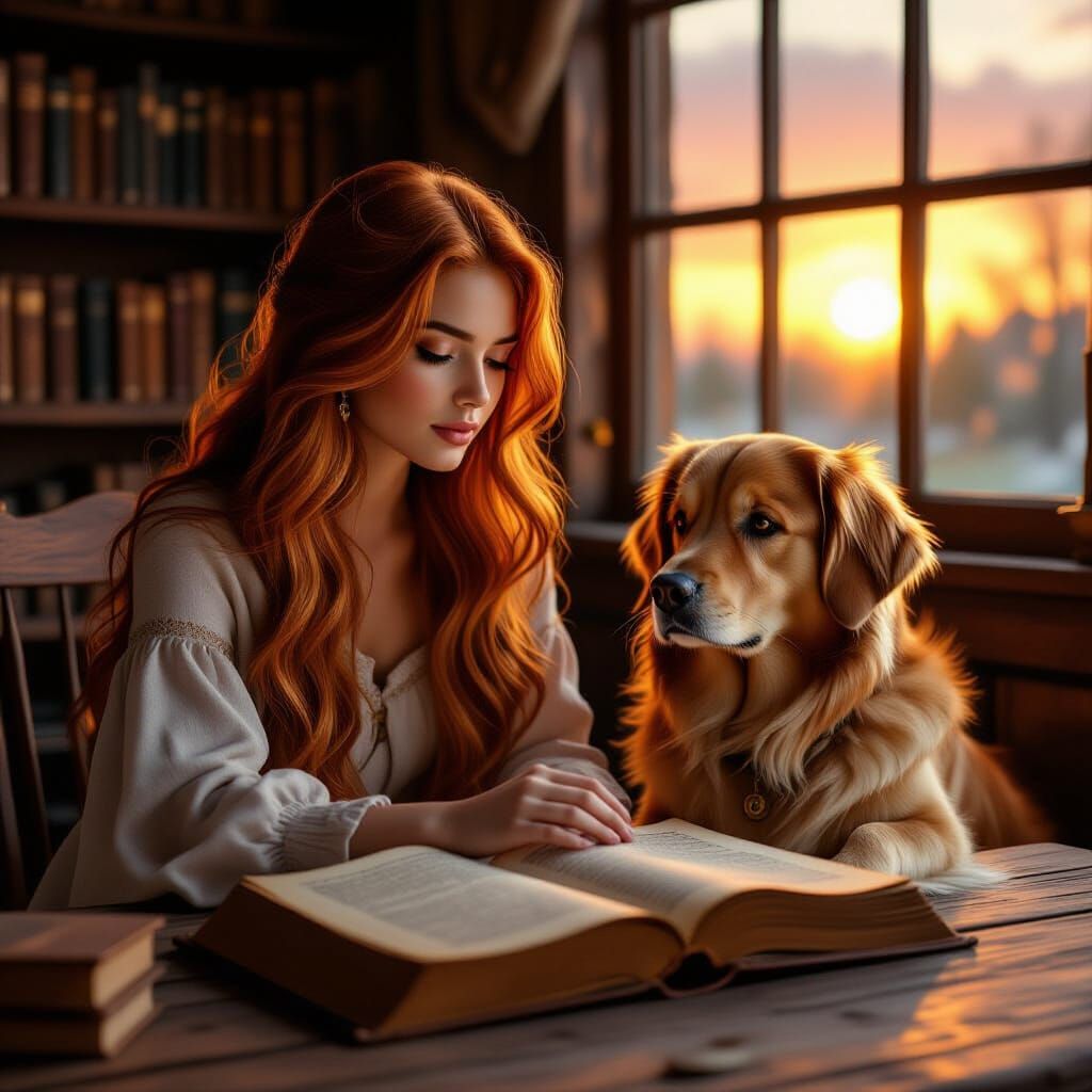 A young woman with long, flowing hair sits at a table, reading a book. Beside her, a golden retriever gazes intently at the pages, creating a serene, cozy atmosphere.