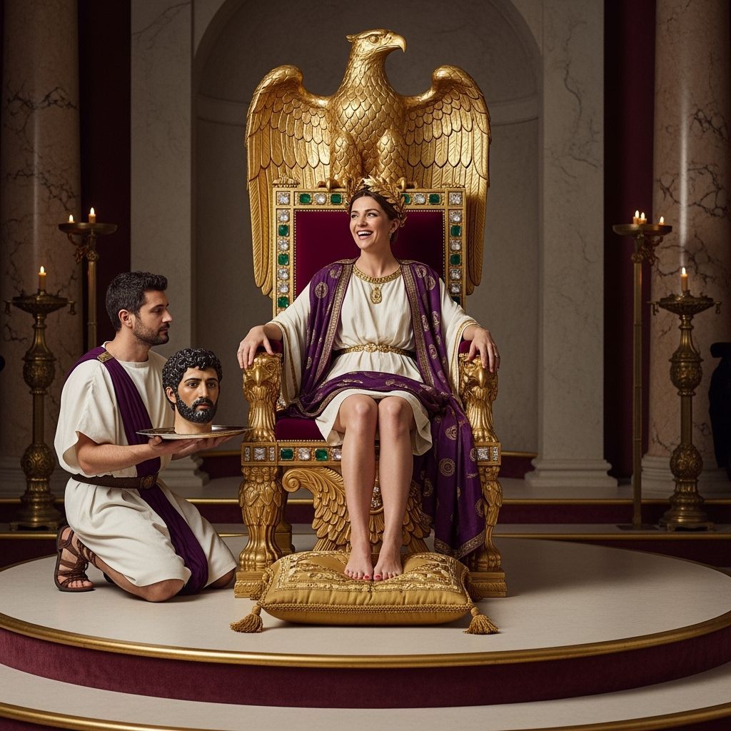 This image shows a Roman Empress laughing on her throne in a vast throne room. The photograph, reminiscent of professional photography, captures the opulence with bokeh and natural lighting.
