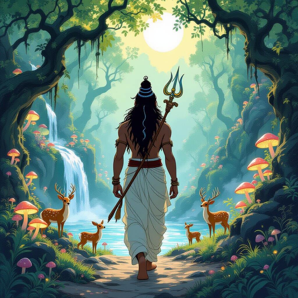 This image shows a young Lord Shiva walking through an enchanted forest. The vibrant scene includes glowing mushrooms, crystal waterfalls, and deer, all rendered in a whimsical Ghibli-style aesthetic.