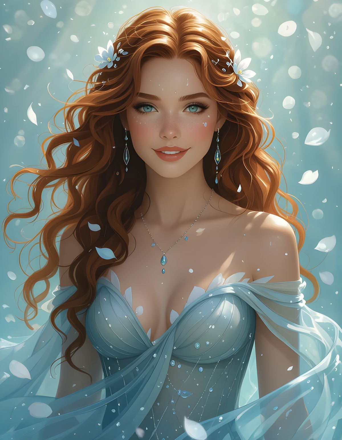 This image shows a Norse water goddess smiling warmly. She wears a flowing dress of delicate water petals, with iridescent droplets and long auburn hair, rendered with soft, ethereal lighting.