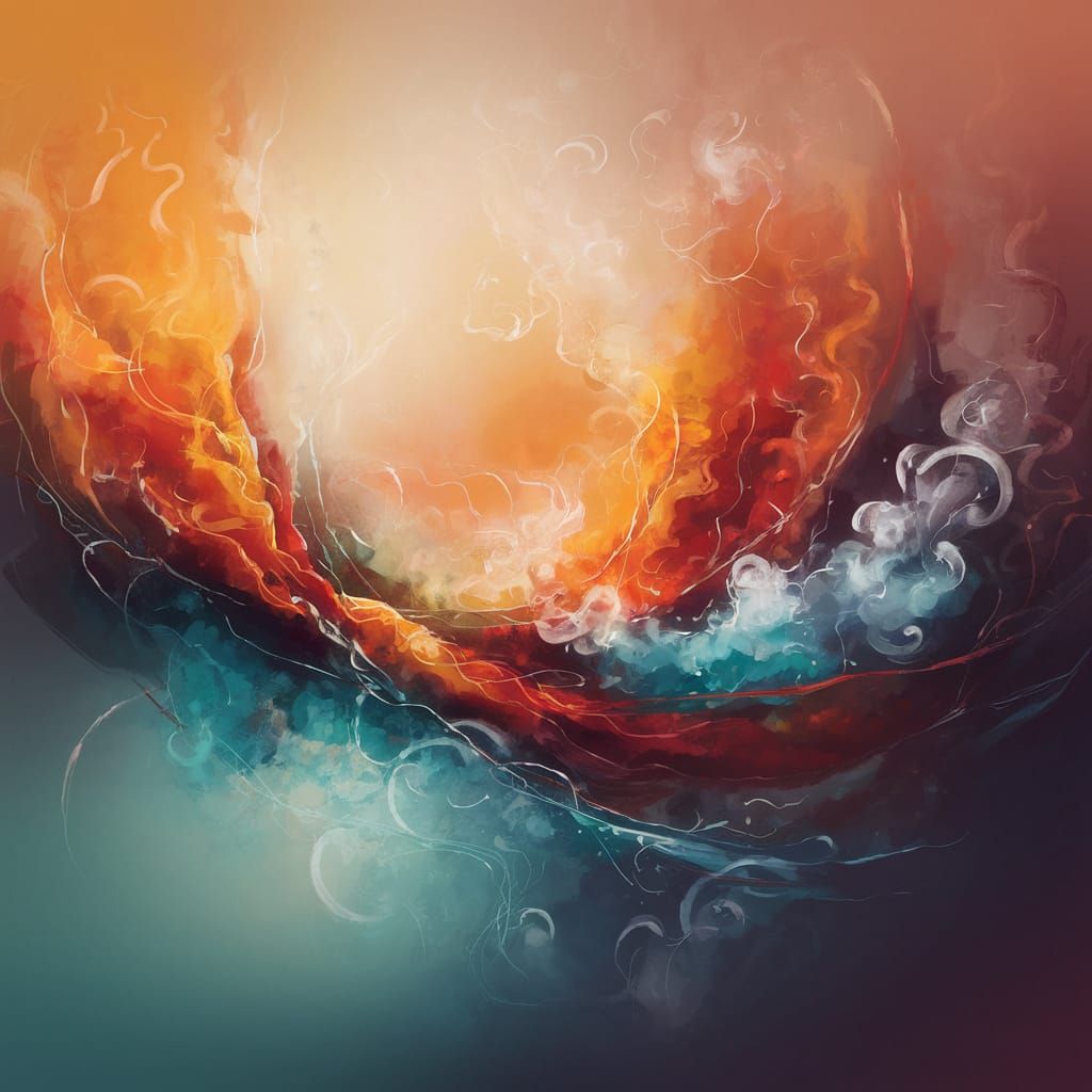 This abstract image depicts a vibrant dance of warm and cool hues, blending water and flames into a mesmerizing scene with wispy clouds and a warm sunset background.