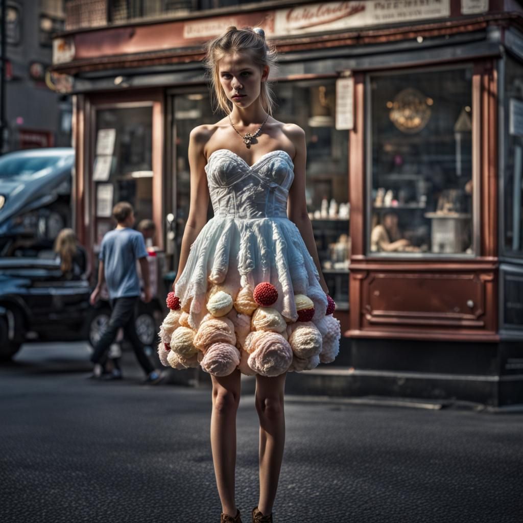 This image shows a dress that appears to be made from ice cream. The artwork showcases intricate details, high resolution, and a hyperrealistic style, creating a cinematic and atmospheric mood.