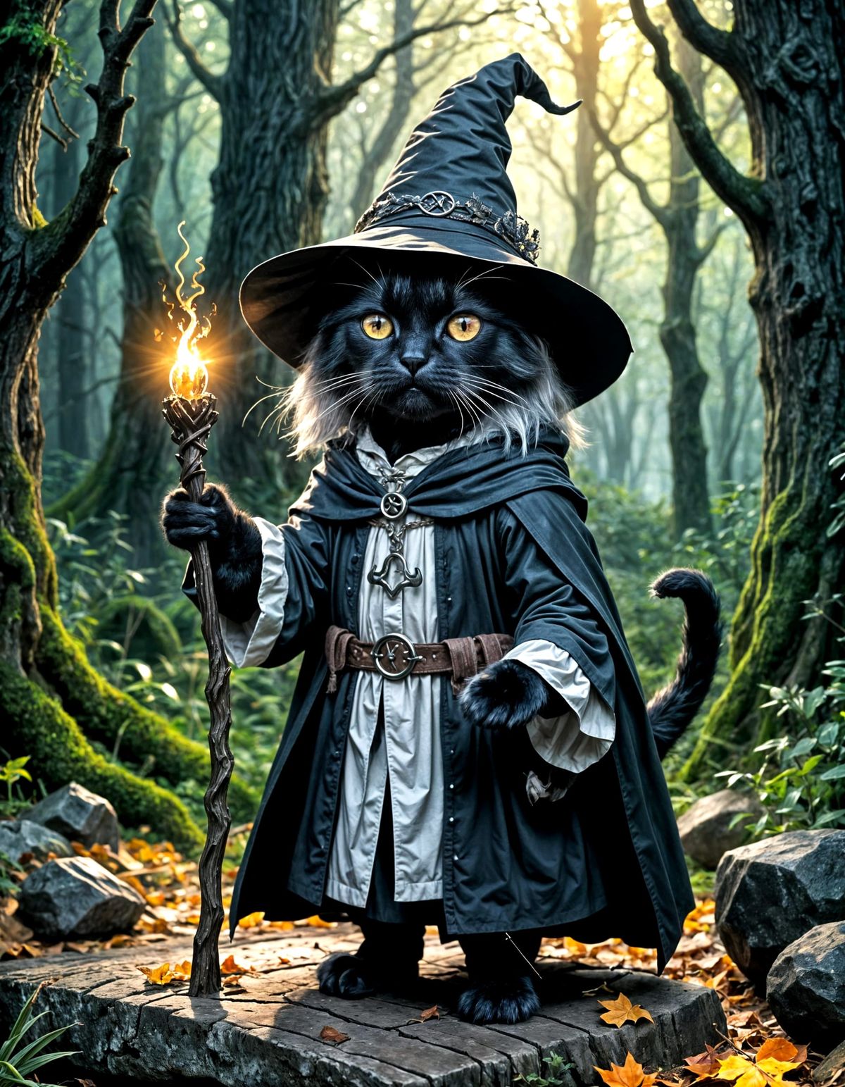A magical black cat dressed as a wizard casts a spell in an enchanted forest. The scene features cinematic lighting and vivid colors, creating a fantasy atmosphere.