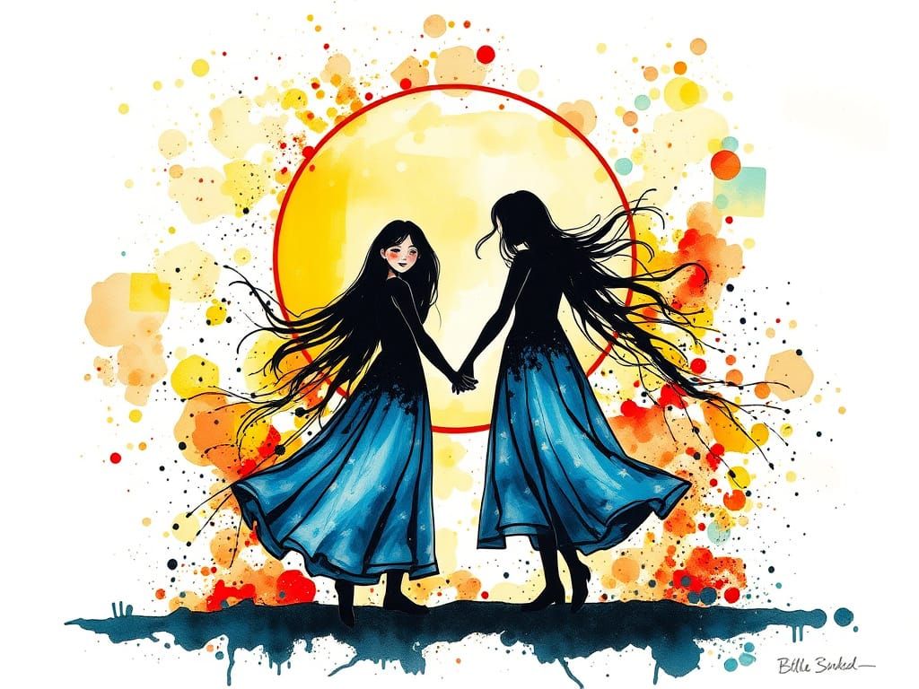 This image shows a pair silhouetted against a vibrant sunset created using a splatter ink technique. The artwork evokes a dreamlike and ethereal quality through its abstract style.