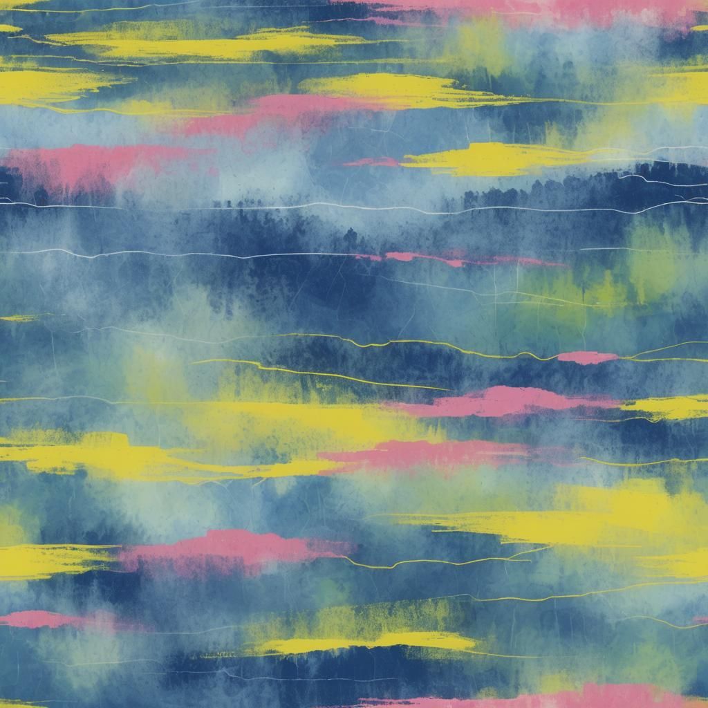 A color field painting reminiscent of Rothko's style showcases a misty meadow with ultramarine, neon yellow, white, and pink accents. The abstract artwork features minimalist elements.