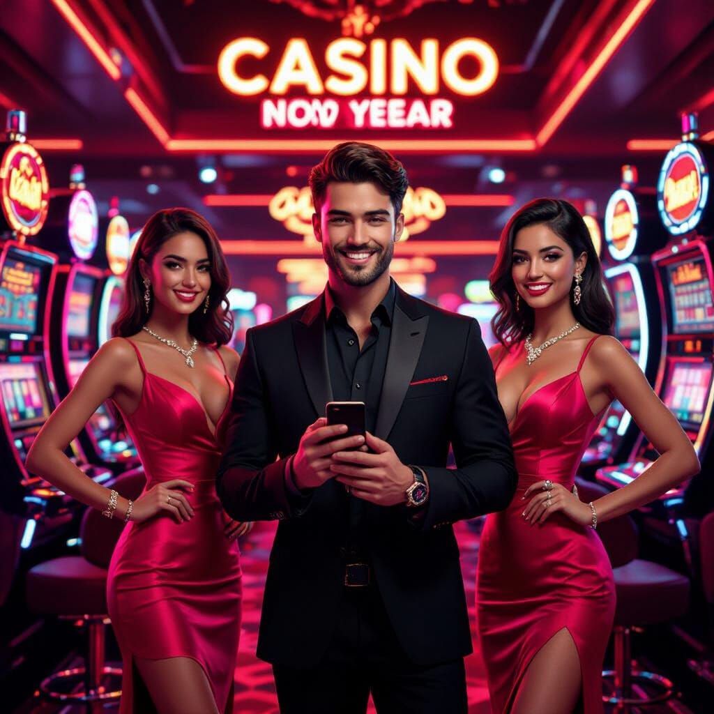 This image shows a handsome man and two women in a vibrant, neon-lit casino. The scene, rendered as 3D digital art, features a glowing lightning bolt and space for text. It has a semi-realistic, stylized aesthetic.